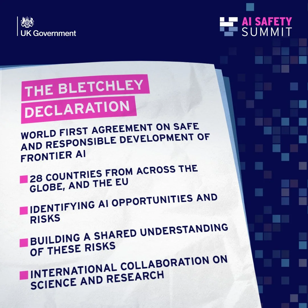 《布莱切利 AI 宣言》呼吁和倡导以人为本,希望 AI 科研机构、企业等以负责任的方式,设计、开发和使用 AI。该《宣言》肯定了 AI 在改善人类福祉上的巨大潜力,也警告了在发展 AI 过程中有意或者无意带来的伤害,希望通过法规等方式避免相关风险。