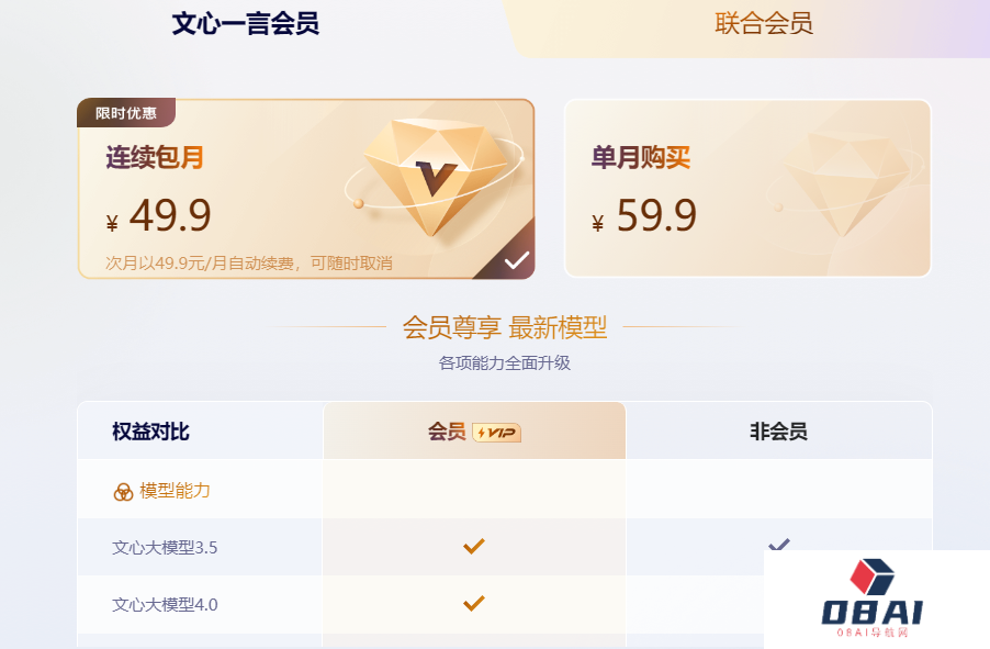 据介绍,文心一言会员单月购买价格为59.9元,连续包月价格为49.9元(次月起以49.9元/月自动续费,支持随时取消)。此外,百度还推出了文心一言+文心一格(白银)的联合会员套餐,价格为99元/月。