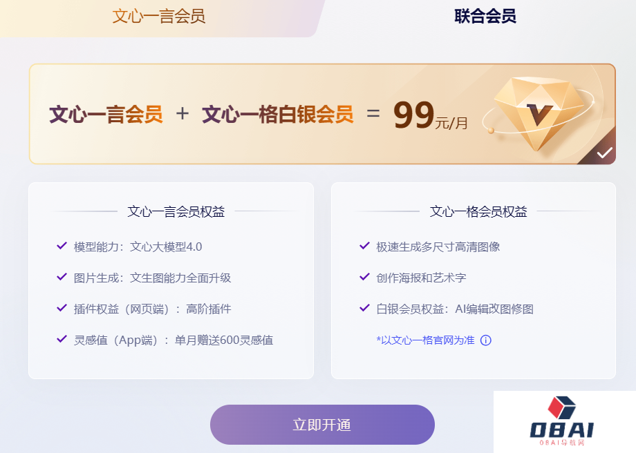 模型能力:文心大模型 4.0图片生成:文生图能力全面升级插件权益 (网页端):高阶插件灵感值 (App 端):单月赠送 600 灵感值文心一格的会员权益如下: