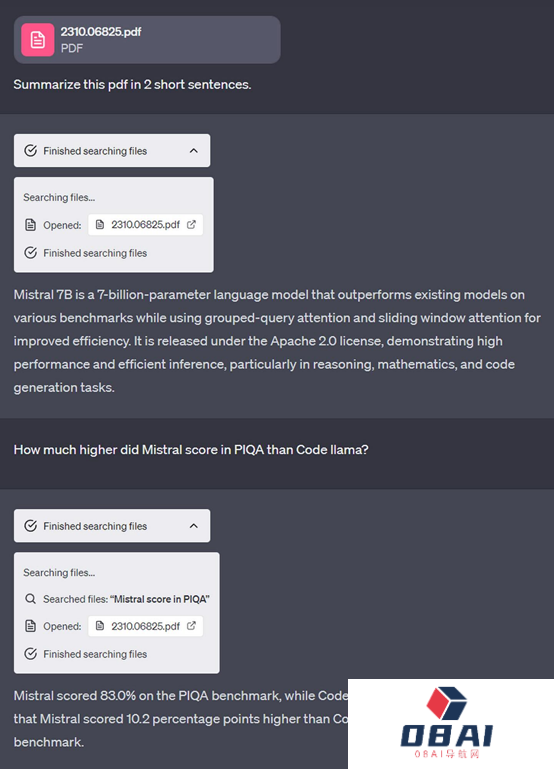 分享用户展示了ChatGPT的PDF分析功能:他上传了一份开源大语言模型Mistral 7B的说明文档,然后提问,用两句话总结一下这份PDF文档。