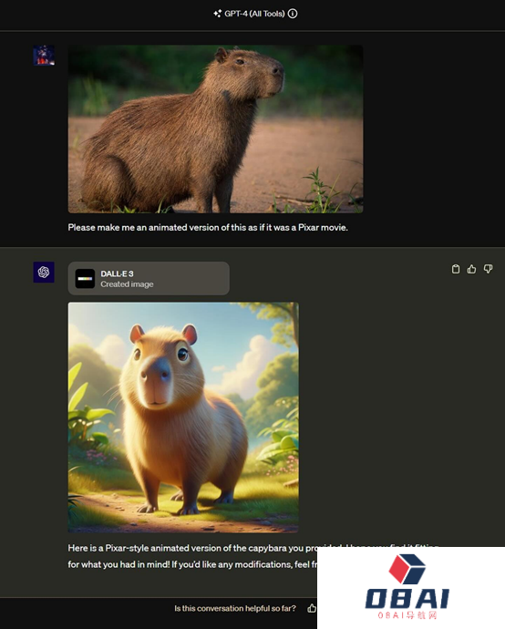 上传一张水豚的图片,然后让其按照皮克斯的风格重新生成一下。