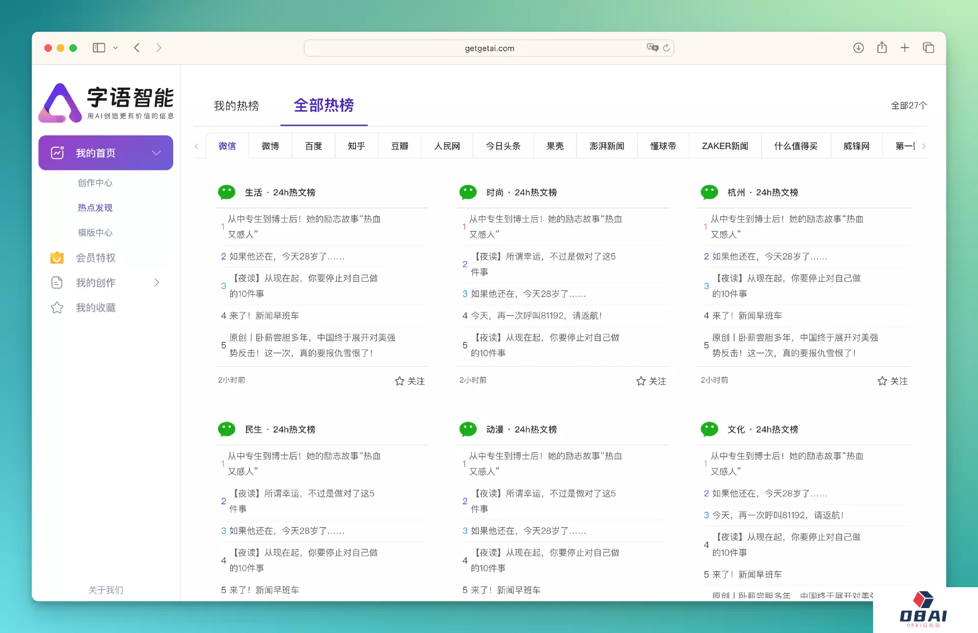 1. 适用人群广泛:无论是学生、老师,还是作家、编辑、记者、营销人员等,都可以利用字语智能来完成各种写作任务,或者寻找灵感和思路。2. 文章模板涵盖领域丰富:产品内置了相当多垂直领域的文章撰写模板,涵盖文化、娱乐、女性、运动等,非常利好对于对应领域的内容创作者。3. 内置全网热点资讯榜单:包括微信、微博、百度、知乎等近 30 家主流平台的榜单信息,可以帮助创作者(尤其是从事新媒体行业的作者)快速寻找适合的写作选题。