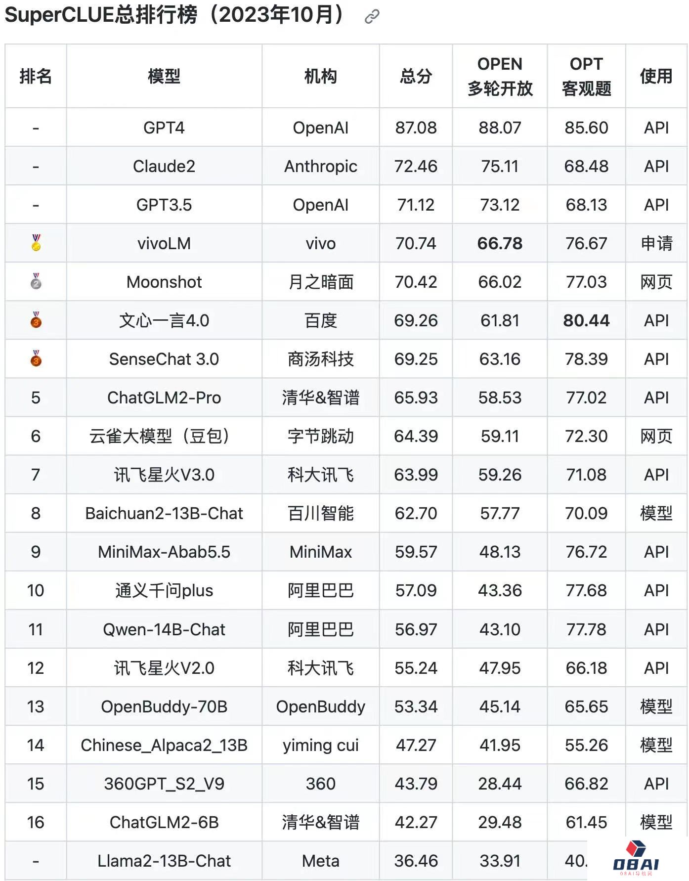 SuperCLUE中文大模型测评基准10月榜单发布:GPT-4稳居第一