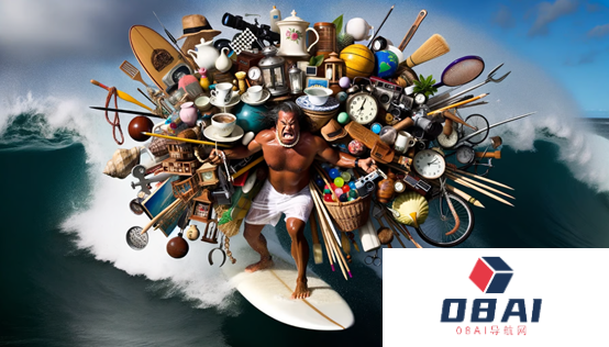 一张照片中,一位皮肤古铜色的中年波利尼西亚男性冲浪者奋力冲浪,手里拿着50 件物品,包括茶杯、自行车、雨伞、烛台、口琴、地球仪、笔记本、羽毛、秒表、棋盘、弹珠、围巾、灯笼、画笔、凉鞋、指南针、望远镜、扳手、花瓶、溜溜球、鹅毛笔、水壶、书包、贝壳、挂坠盒、铅笔、日晷、卷尺、算盘、袖扣、保龄球、口哨、抹刀、抹刀、沙漏、大礼帽、笛子、显微镜、拼图游戏、放大镜、飞盘、陀螺、手电筒、跳绳、开罐器、风铃、盆景树、擀面杖、热水瓶和打字机等。海浪在他周围拍打,他的表情充满痛苦和轻微的恐慌,并试图平衡物体和他的冲浪板。