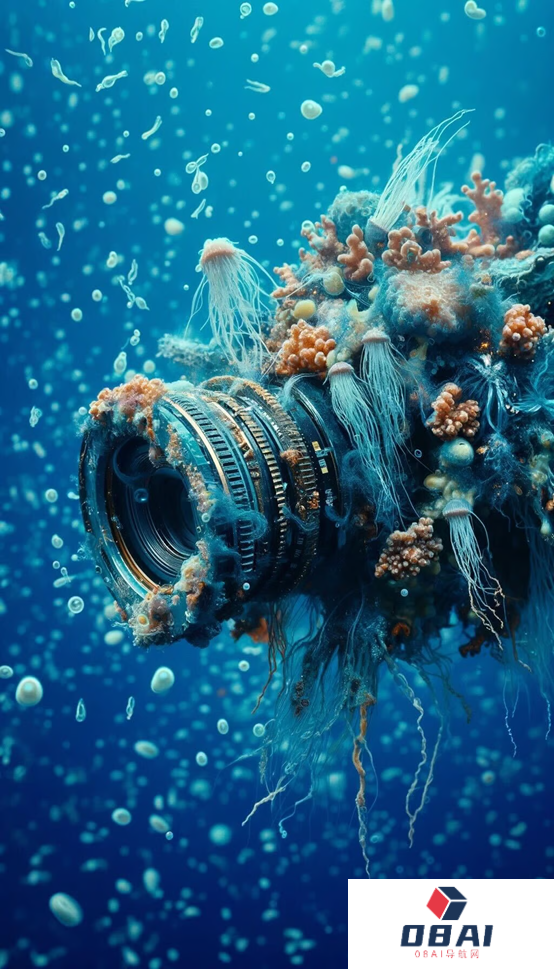 由珊瑚和水母制成的相机,沉浸在广阔的蓝色海洋深处。相机的外表面饰有珊瑚和闪亮的金色金属装饰。深蓝色的背景上充满了微小的漂浮微生物,采用高质量的光学器件进行描绘,使图像具有胶片颗粒纹理和柔和的色彩。