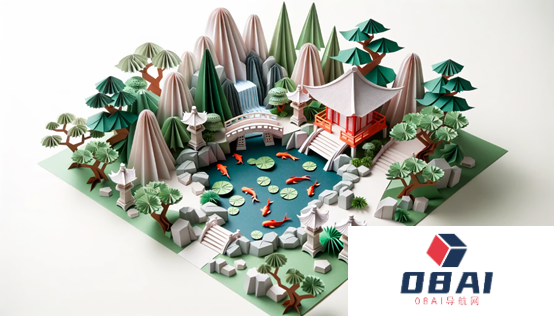 精致纸张上的剪纸插图,略有磨损,错综复杂的 3D 立体弹出式花园,配有锦鲤池和石灯笼,通过精确的切割和折叠使自然场景栩栩如生,雕塑设计艺术。