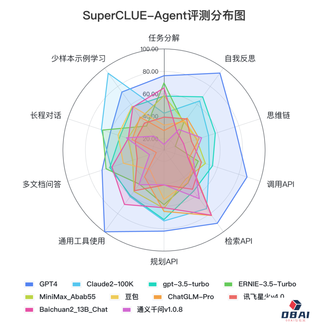 经过针对16款支持中文的大语言模型的测评,SuperCLUE发现:在Agent的核心基础能力中文任务上,GPT-4模型大幅领先;同时,代表性国内模型,包括开源和闭源模型,已经较为接近GPT-3.5水平。