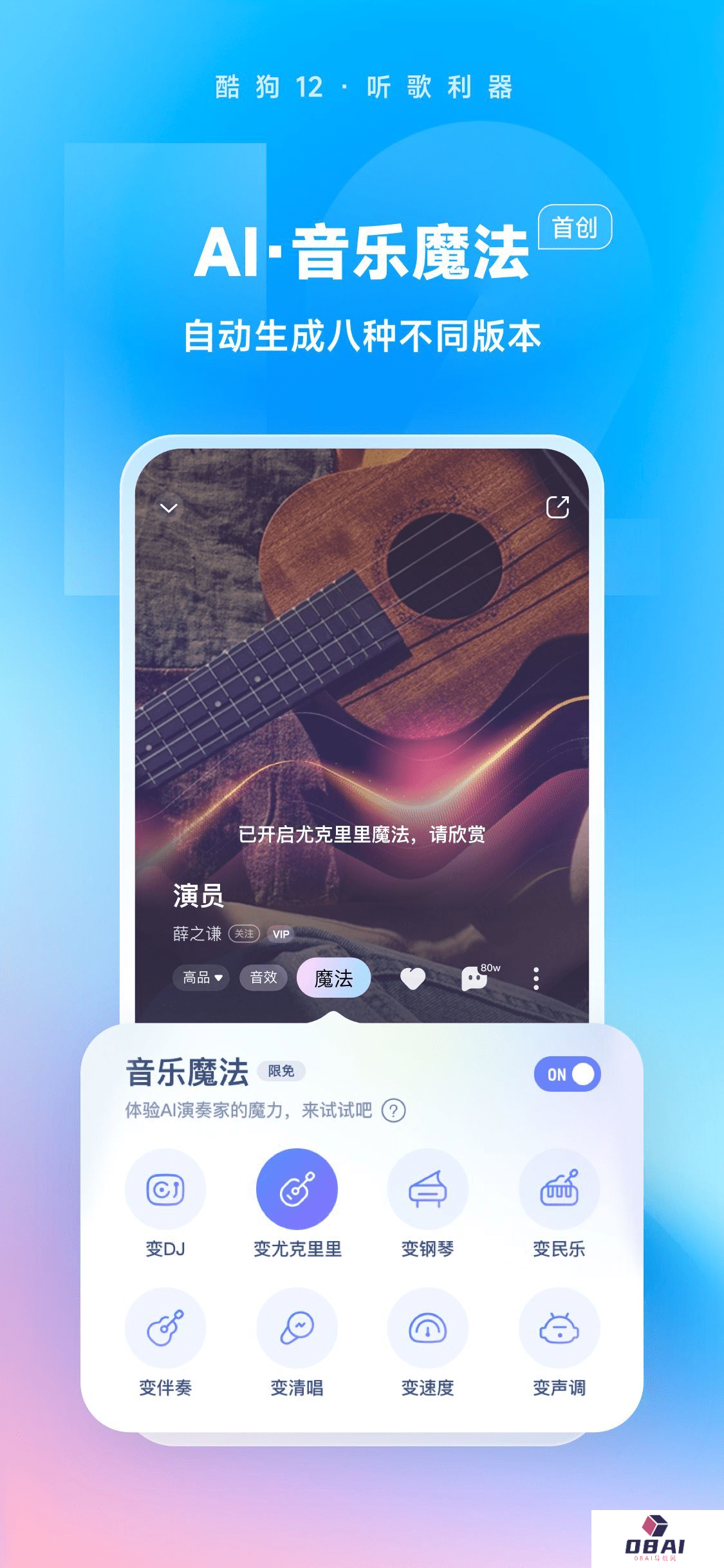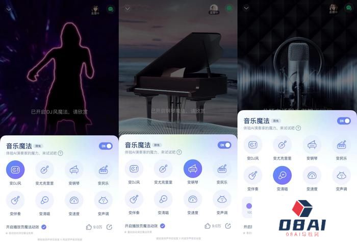 ②第二项AI升级,就是引入AI编曲功能的“AI音乐魔法”,首次在国内实现了将歌曲自动生成为DJ风、尤克里里、钢琴、乐器、伴奏、清唱等八种不同流派版本。