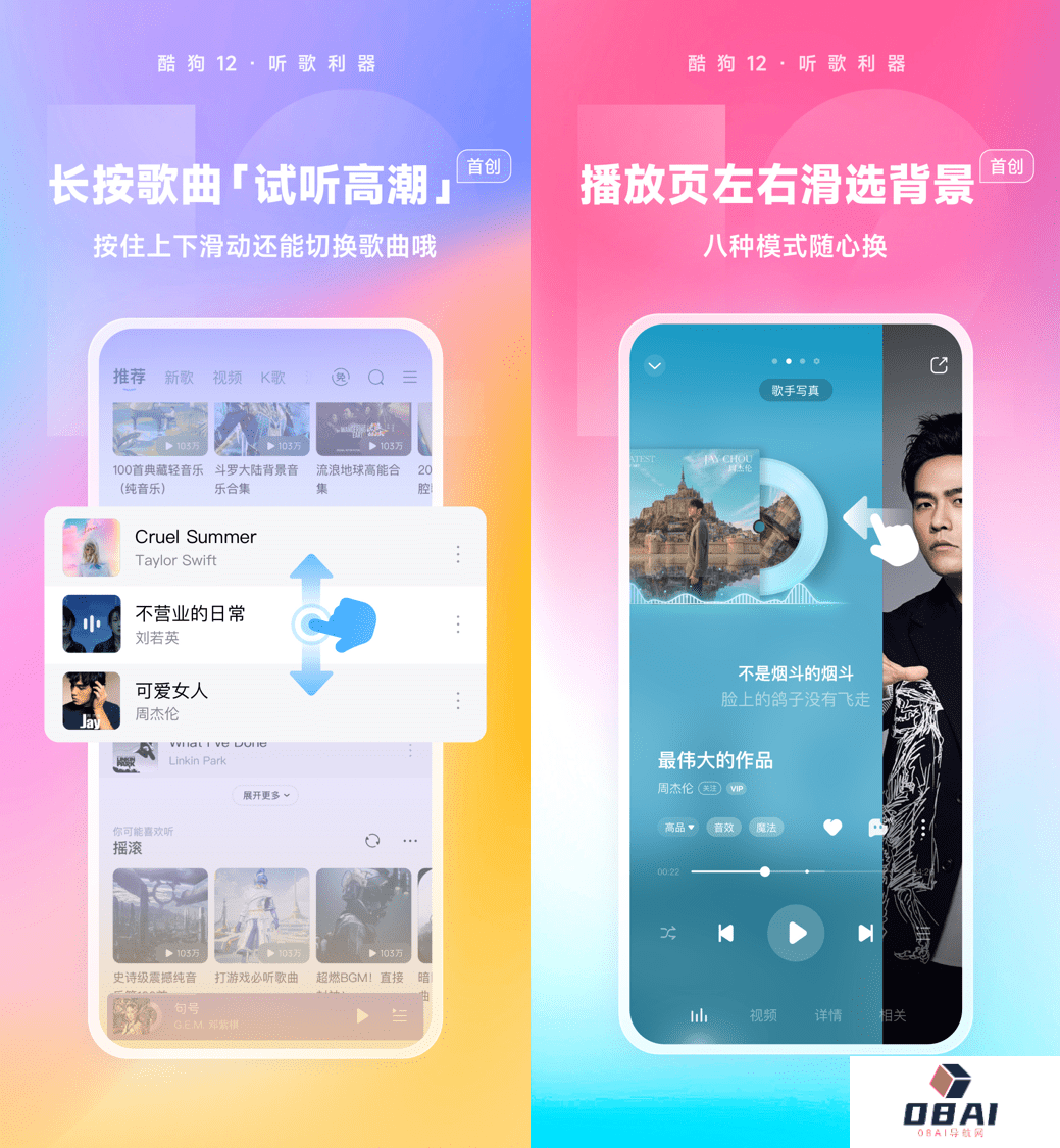 除此之外,酷狗音乐V12版本加入四种创新操作手势——单击封面下一首插播、双击歌曲马上插播、长按歌曲试听高潮以及播放页左右滑动选择背景。此外,在播放页往上滑开启“歌曲漫游”,自动播放预览歌曲“更多版本”、“相似歌曲”或“歌手作品”的高潮部分。