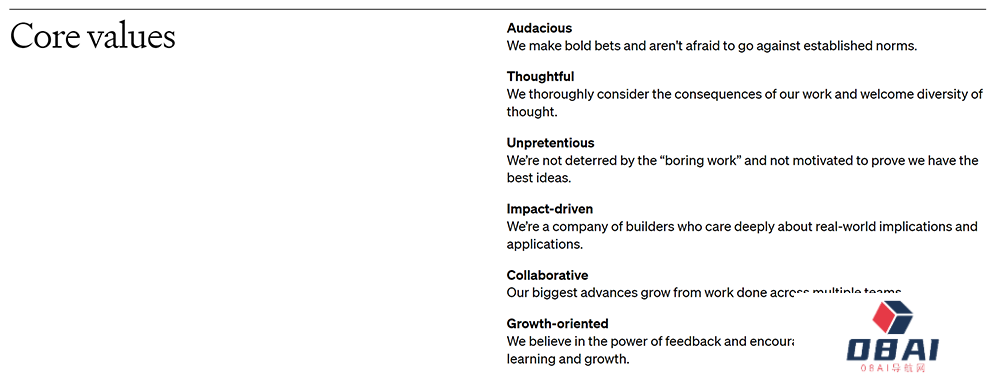 OpenAI此前列出了员工的六大核心价值观,分别是大胆、深思熟虑、朴实无华、影响力驱动、协同合作以及成长导向。