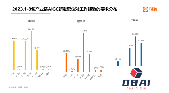 相较基础层和模型层,应用层的AIGC新发岗位中,销售/客服、产品、市场/公关/广告/会展类的占比相对较高,为17.58%、13.67%、8.59%。销售/客服在基础层、模型层的占比相对较小,分别为1.76%、5.39%。