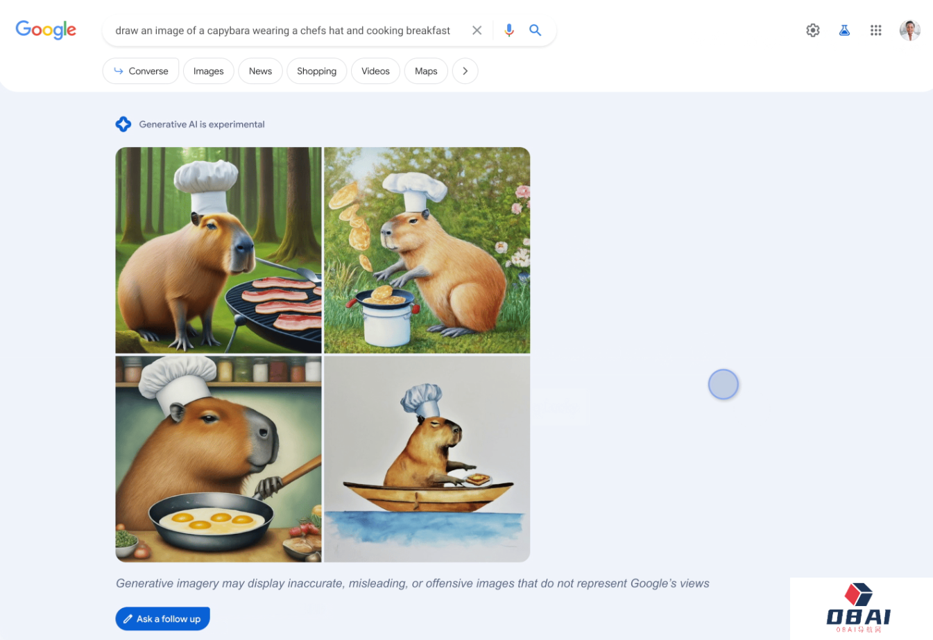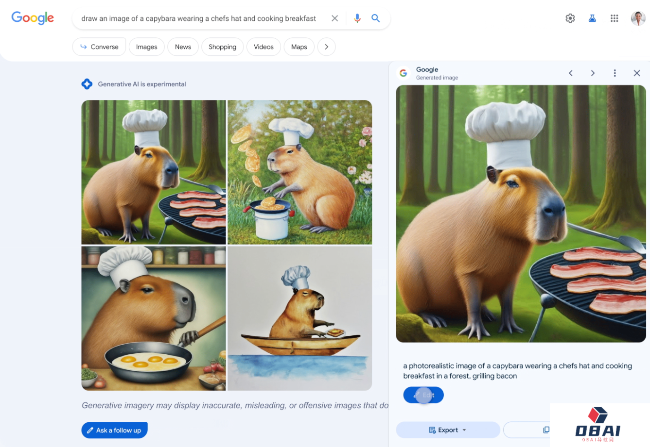 例如,当用户在搜索框输入“请画一张戴着厨师帽,并正在做早餐的水豚”这一提示句组合,并点击“搜索”按钮。谷歌搜索引擎便会生成 4 张符合描述的图画,用户点选其中任何一张,就能看到它们对应的关键词,重新编辑这些关键词,可以用于修改画面细节。