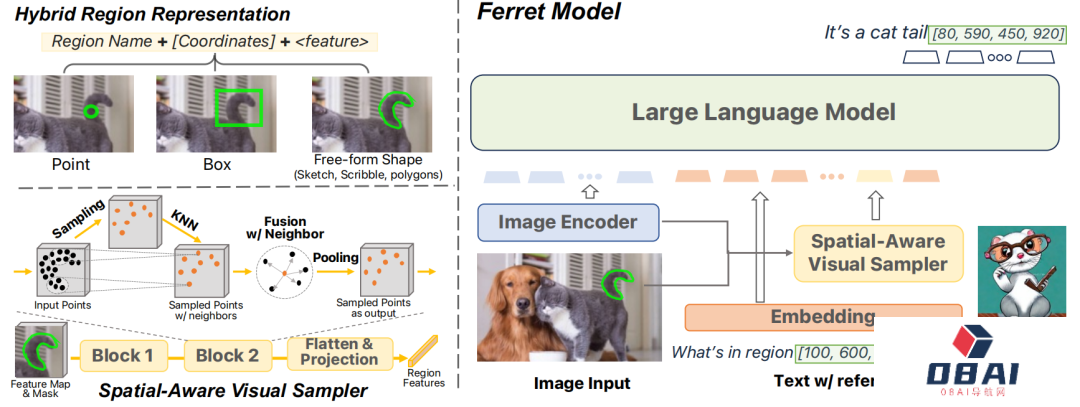为了实现这一目标,Ferret模型的架构包括图像编码器、空间感知的视觉采样器和语言模型(LLM)等组成部分。