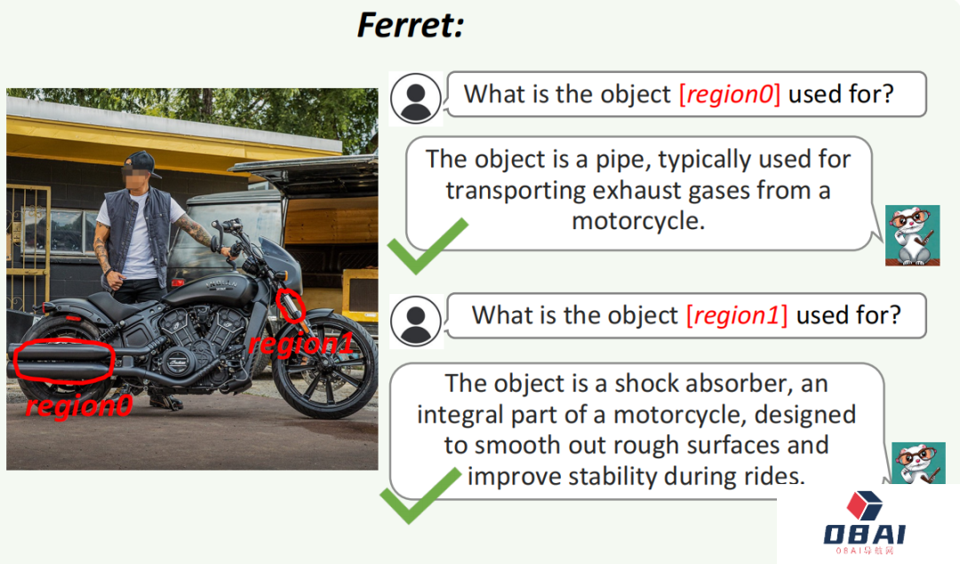 它具备更强的图文关联能力,提升了大模型在“看说答”任务中的精确度。比如,下图中非常细小的部件(region 1),它也可以分辨出来是避震。