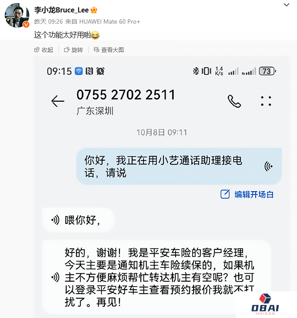 10月8日,华为终端BG CTO李小龙在微博上剧透了华为鸿蒙语音助手“小艺”的通话及语音转写功能,并声称新功能很好用。他以AI帮助接听平安车险的销售经理的电话为例,“小艺”可以帮助用户对付销售电话的来访。
