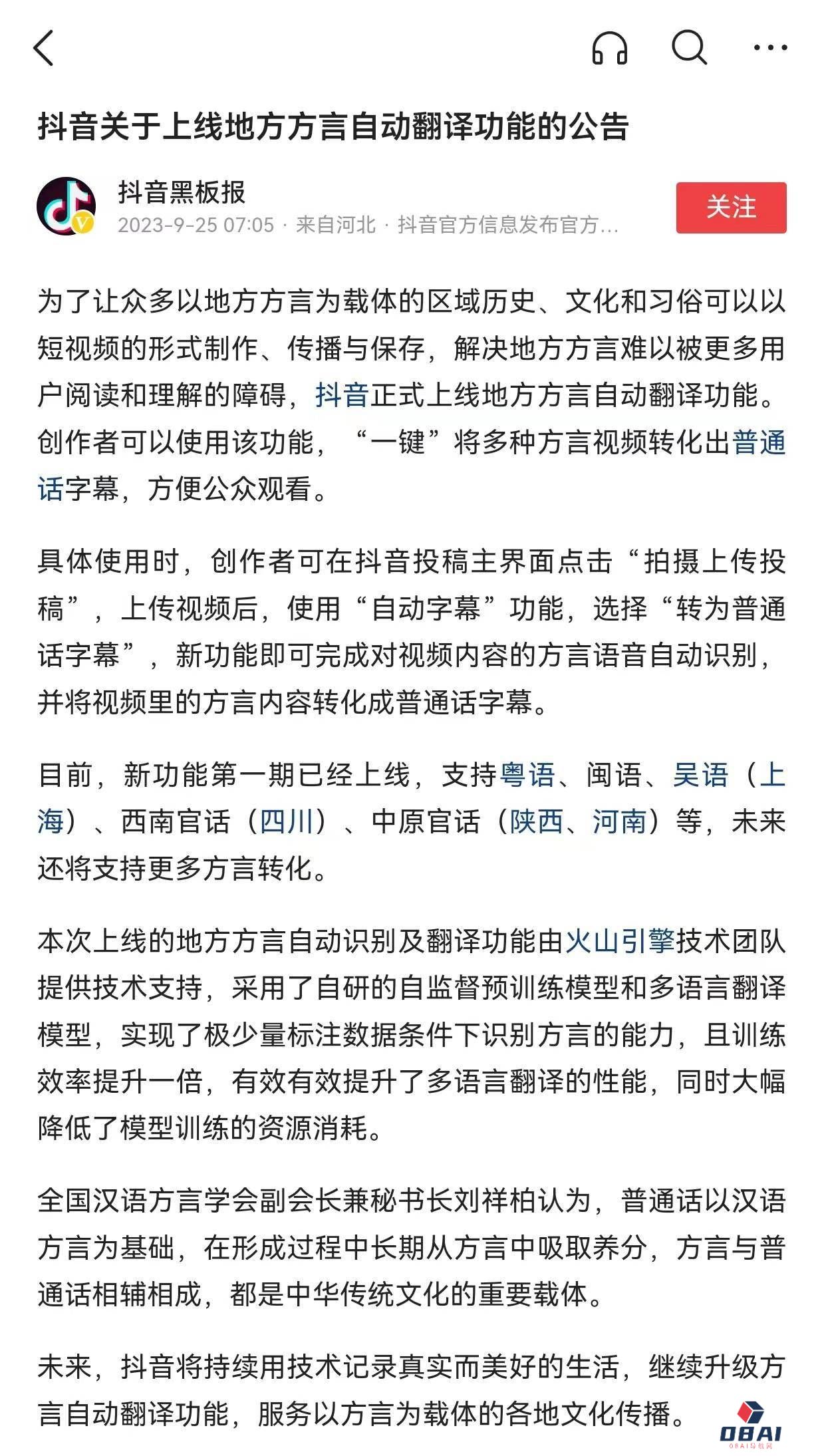 抖音APP上线方言AI翻译功能
