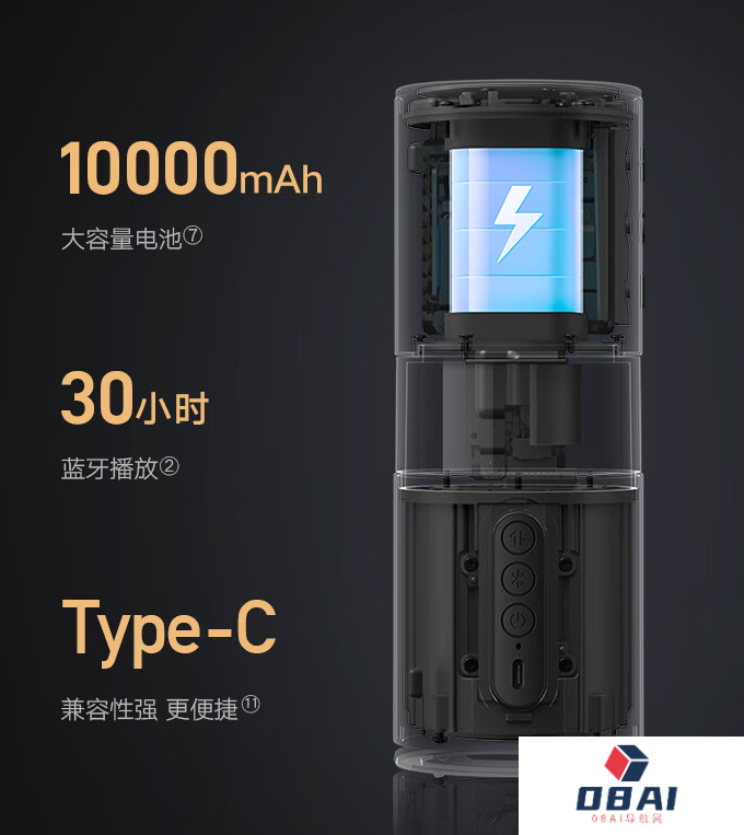 音箱内置10000mAh电池,采用蓝牙2.4G与手机、电脑连接,最长可达30小时播放。