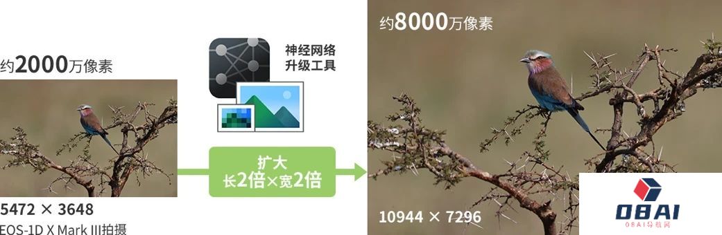 神经网络升级工具则可将 JPEG、TIFF 图像的长边和宽边的分辨率分别扩大 2 倍,获得 4 倍于原始分辨率的图像,且不受拍摄机型限制,即使是佳能历史机型拍摄的照片也可以用该工具进行升级。