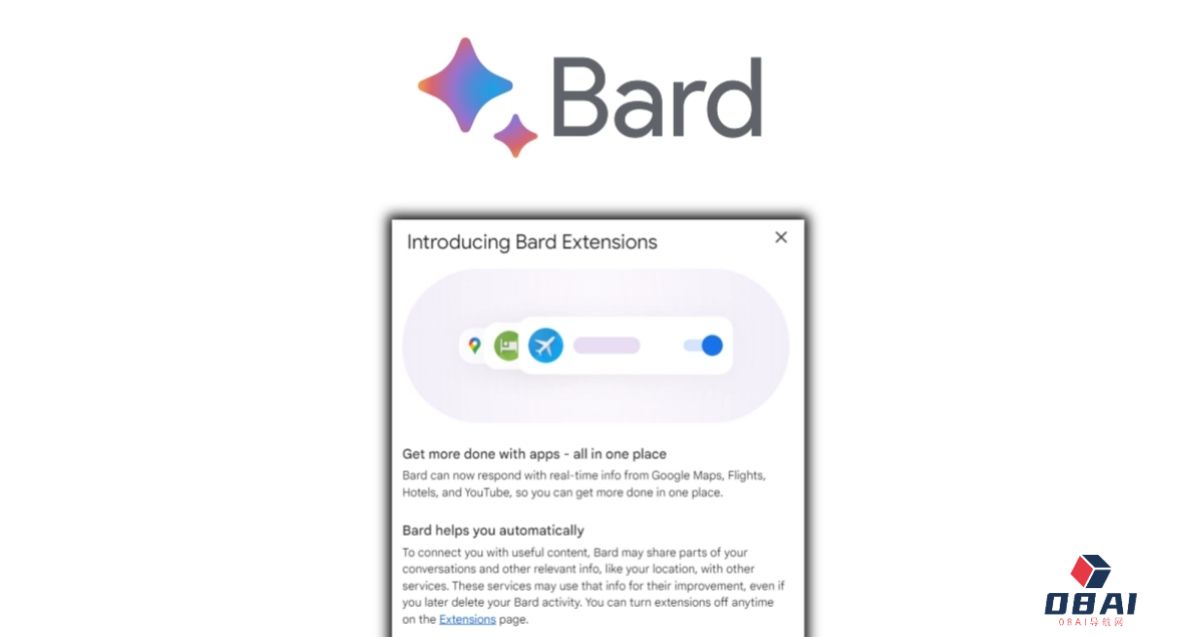 谷歌应用的插件可以让Bard访问和使用来自Maps、YouTube、Hotels和Flights等应用的实时信息闭。这些插件都是默认开启的,允许Bard访问并处理来自扩展应用的实时信息,用户可以通过在提示框中输入“@”和扩展名称来快速选择扩展,也可以随时将其关闭。