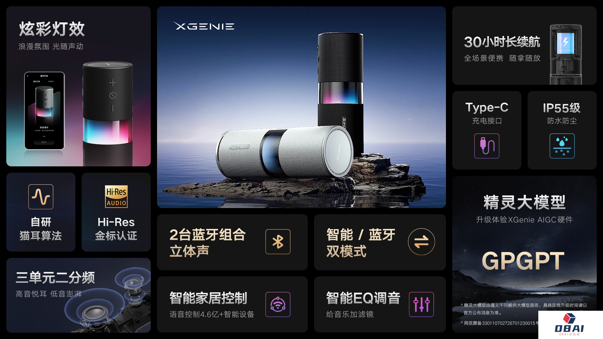 具有30小时长续航能力,多种氛围灯效,就算到了野外场景,也能拥有个性化助手。通过精灵智能声学的调试,具有户外和室内的不同声音表现。实现了高电压高功率高瞬态的声学设计,在峰值功率情况下,声音表现稳定,还能有业内评测最高的唤醒和识别率。