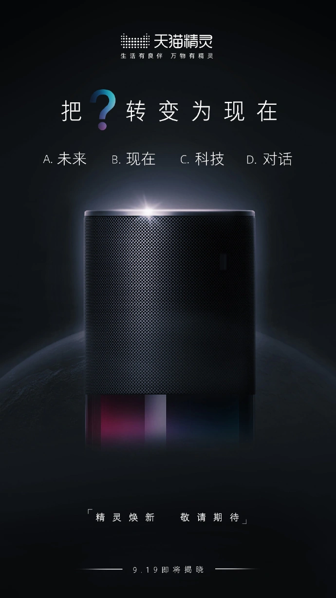 据天猫官方发布消息称,9月19日,天猫精灵将发布新的智能音箱产品,通过预热海报可以了解到,新产品已确认更名并接入大模型。