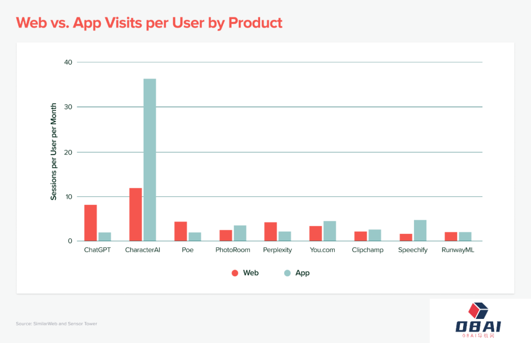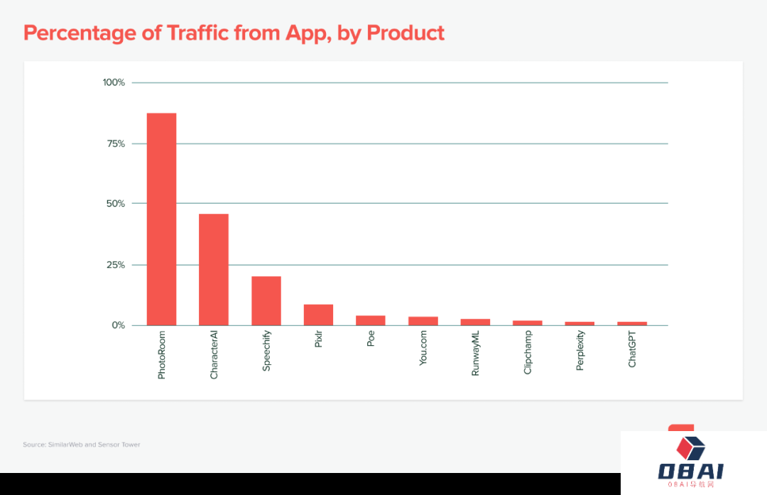 有三个例外值得注意:专业消费者设计工作室PhotoRoom(估计88%的流量来自应用)、伴侣应用CharacterAI(46%的流量来自应用)和文本转语音产品Speechify(20%的流量来自应用)。与他们的网站相比,这些公司在其APP上看到了更多的流量参与度。