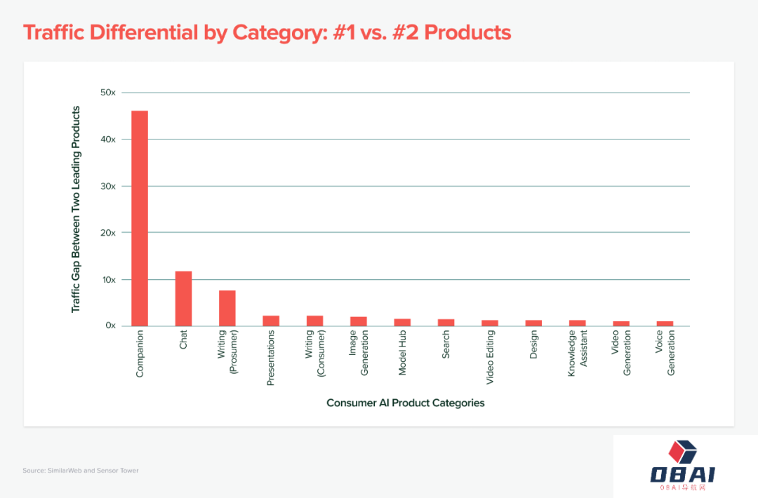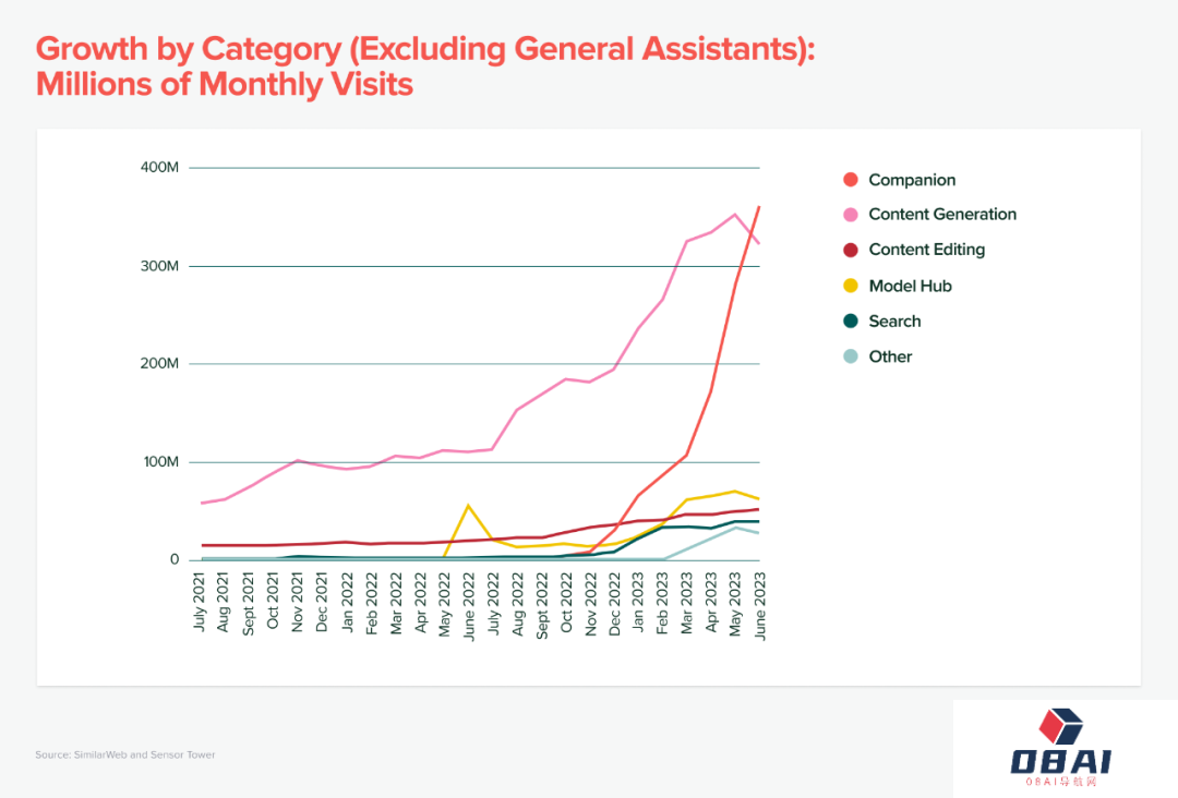 近几个月来,另外两个类别开始启动——AI伴侣(如CharacterAI)和内容生成工具(如Midjourney和ElevenLabs)。