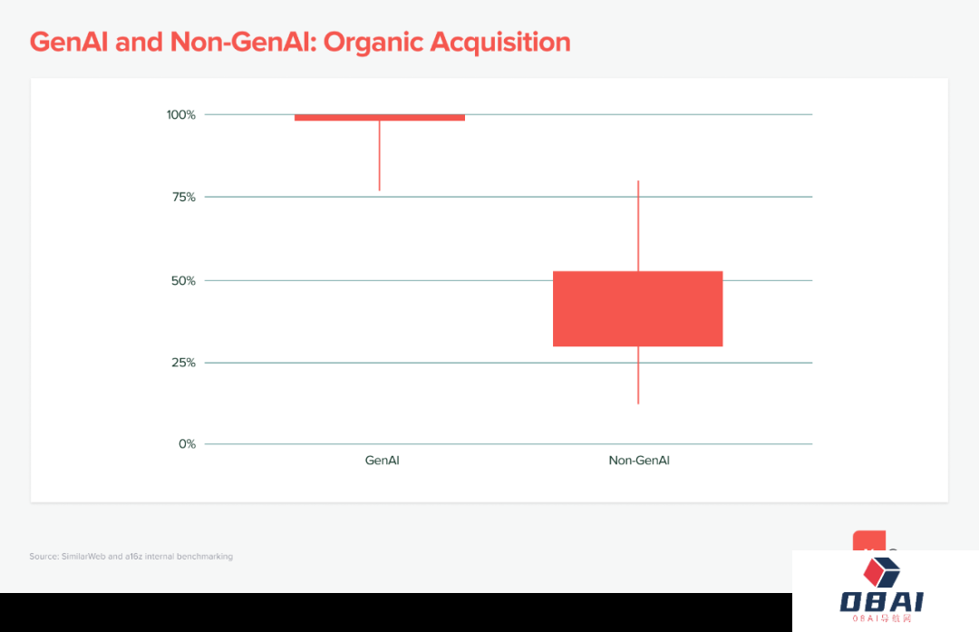 生成型AI产品只有2%的流量来自付费来源。与此相比,非AI消费者订阅公司则有70%的付费流量,这是根据a16z对150个产品的基准测试得出的。