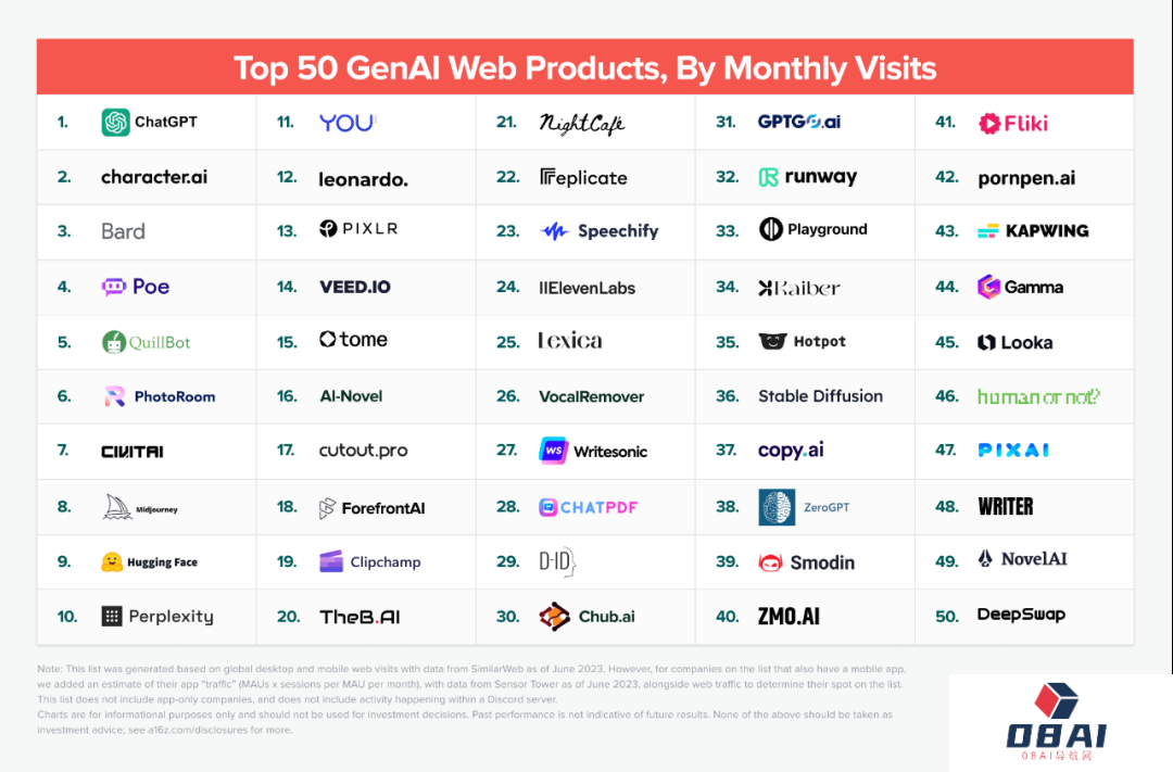 A16Z通过查看今年6月的SimilarWeb流量数据,对月活最高的50个生成式AI网站产品进行了排名。并分析了这些产品随着时间的增长情况,以及增长的来源。对于那些进入名单并且开发了APP的产品,我们加上了来自今年6月同期的Sensor Tower的流量数据,以确定它们的排名位置。