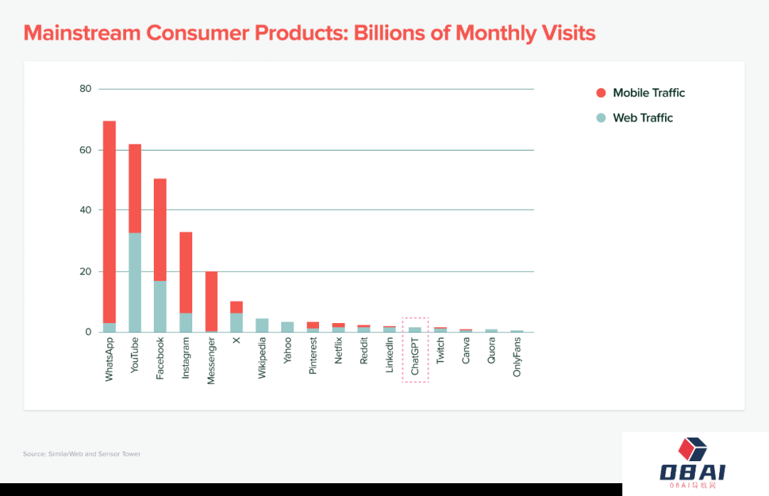 与主流的互联网APP产品相比,ChatGPT的规模与Reddit、LinkedIn和Twitch相当,但仍远远低于WhatsApp、YouTube、Facebook等。