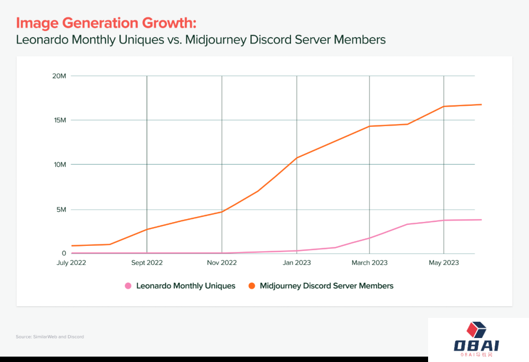 图像生成就是一个例子。尽管Midjourney占据目前AI绘画领域的主导地位,但像专门针对游戏开发的垂类工具Leonardo看到了令人印象深刻的流量增长。下面的图表显示了Midjourney与Leonardo的每月独立访客数进行了比较。尽管规模不同,但Leonardo已经能够在Midjourney继续上升的同时吸引数百万用户。