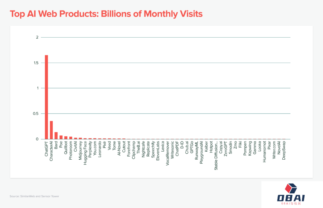 ChatGPT是众所周知的强,到底有多强?它们吃掉了前50名榜单里边的月度流量的60%,估计每月有16亿次访问和2亿月活跃用户(截至2023年6月)。这使ChatGPT成为全球访问量第24的网站。