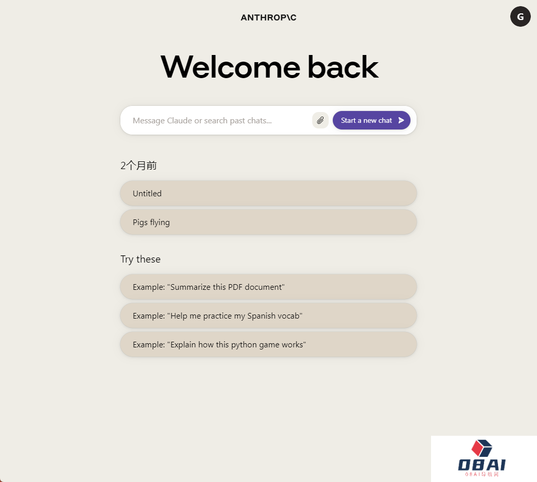 ②然后马上就可以打开Claude 2的熟悉主页,熟悉的米黄色背景。如果此前曾经用过Claude的话,历史聊天记录也都在