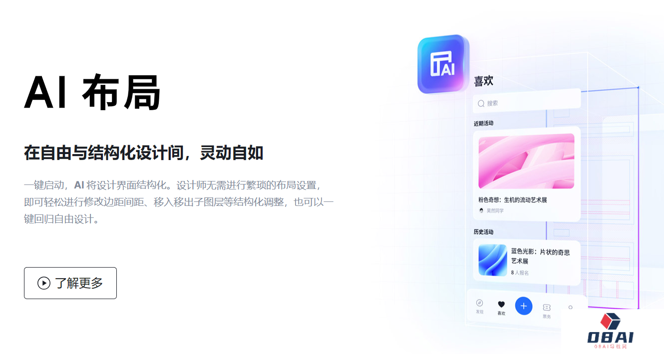 “AI布局”支持一键启动,用AI将设计界面结构化,设计师无需进行繁琐的布局设置,即可轻松进行修改边距间距、移入移出子图层等结构化调整,也可以一键回归自由设计。