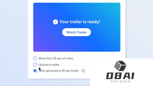 Wix AI甚至还提供了「AI自动生成预告片」的功能,支持将零碎的产品视频片段一键转制为商业宣传片。