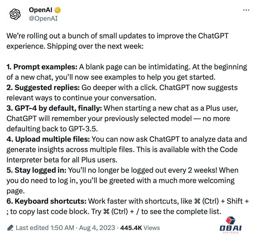 当地时间8月3日,OpenAI官方发布了一系列小更新: