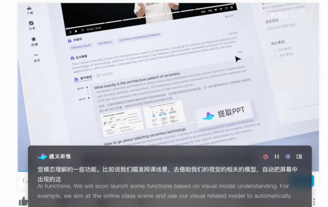 AI奇点网8月3日报道丨阿里云今天升级旗下的“通义听悟”AI工具,推出提取 PPT、浏览器插件、小程序扩展三大功能。官方宣称,这些功能能够帮助用户在 PC 和移动端随时随地听懂、理解、阅读各类音视频内容,提升职场人士和学生的工作学习效率。