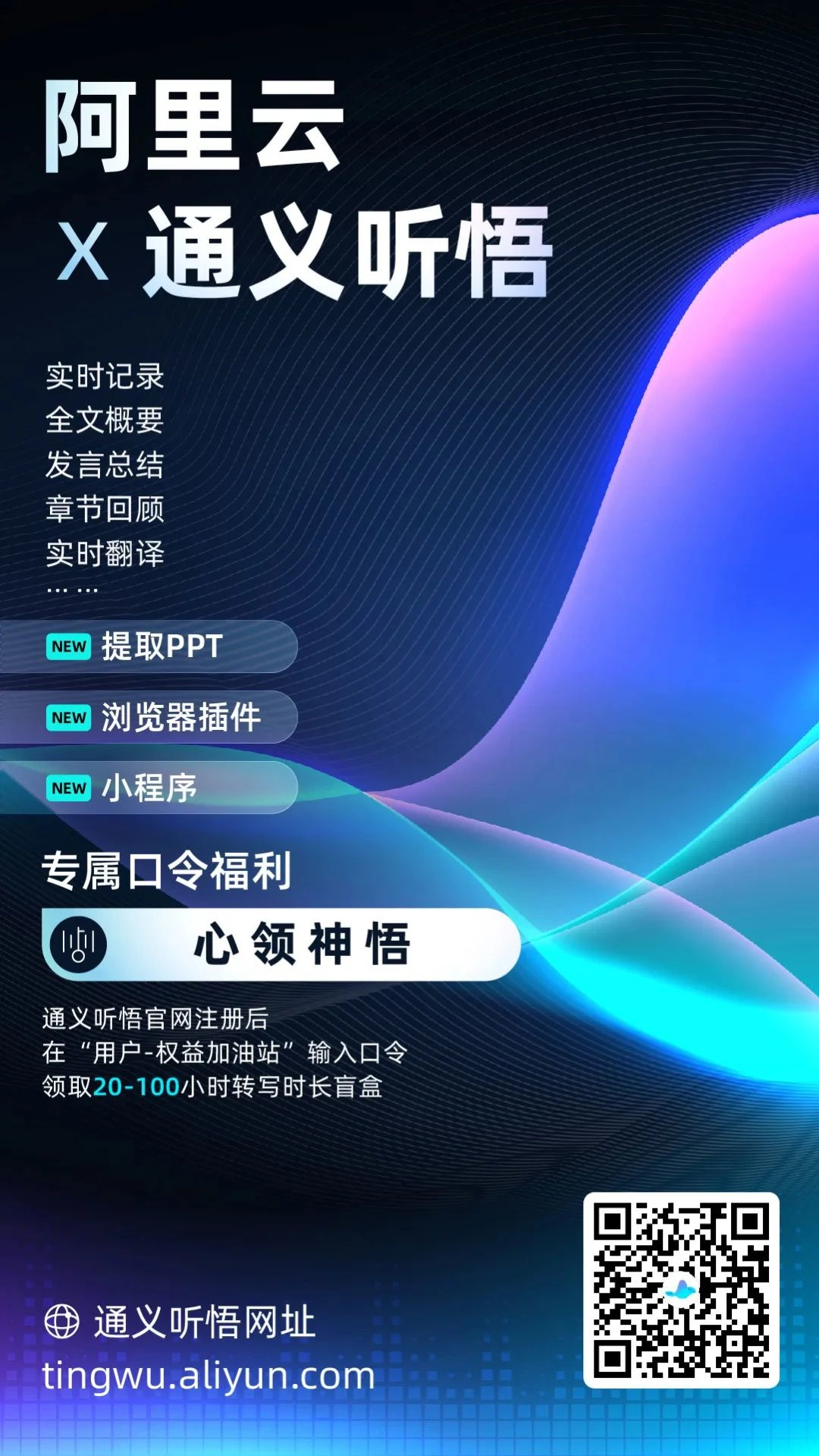 今年6月,阿里云首次宣布通义听悟开放公测,提供实时记录、音视频文件转写、全文概要、章节速览等功能。本次新功能上线期间,阿里云继续联合各大平台和社区推出定制口令码,用户根据口令码可随机抽取20小时、30小时、66小时、88小时、100小时的免费转写时长。