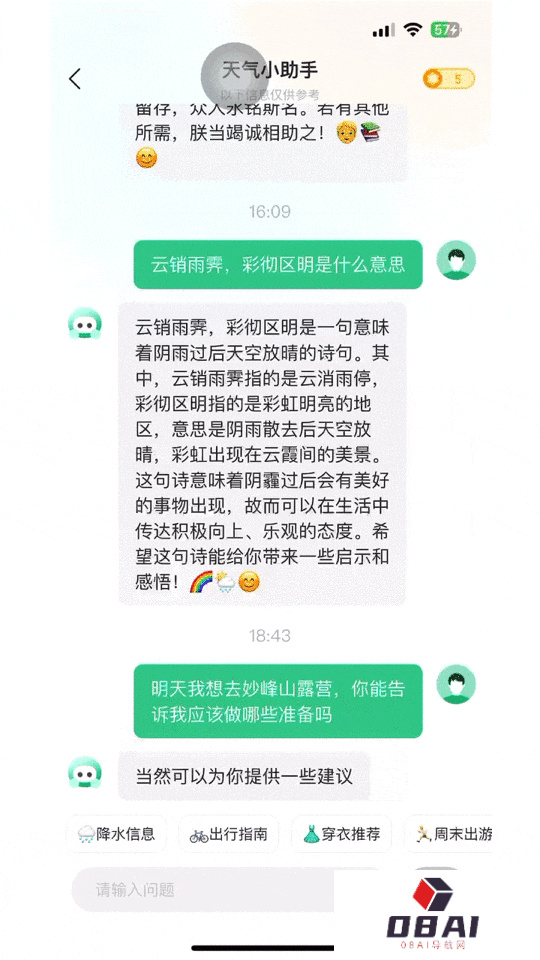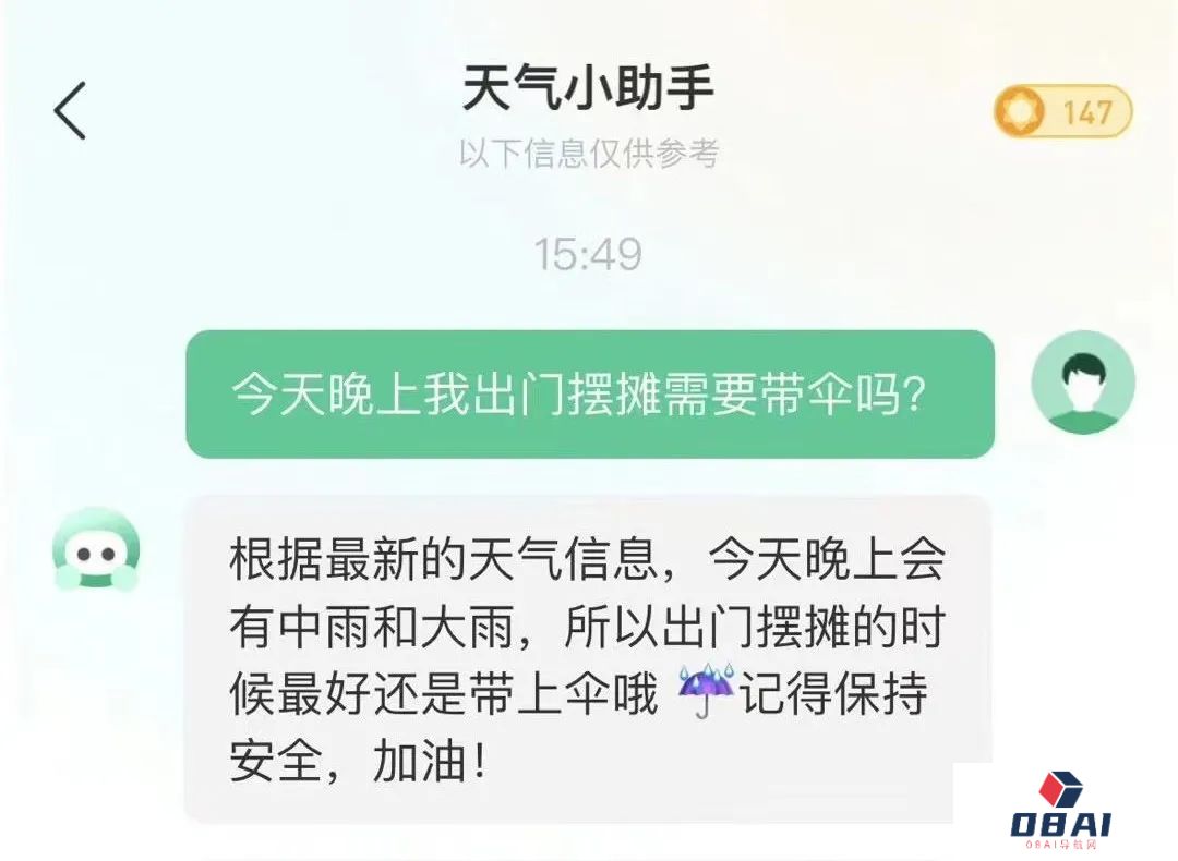 比如说,即将到来的周末,当家人们想外出郊游的时候,可以问询天气小助手关于外出郊游的一些准备工作,小助手会以露营专家的身份直接将答案告诉你,保障你的出行各方面的安全。