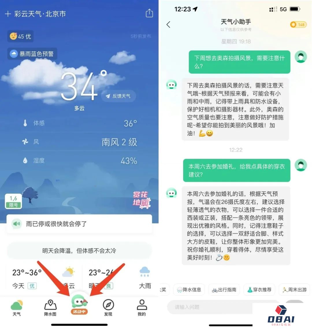 彩云天气在业内率先推出了AIGC人工智能聊天机器人。App内置天气小助手,是答疑解惑的天气百科全书。任何与天气相关的问题,都可以直接以自然语言的方式与机器人进行问询交流,SVIP用户每天可以免费体验50轮对话。