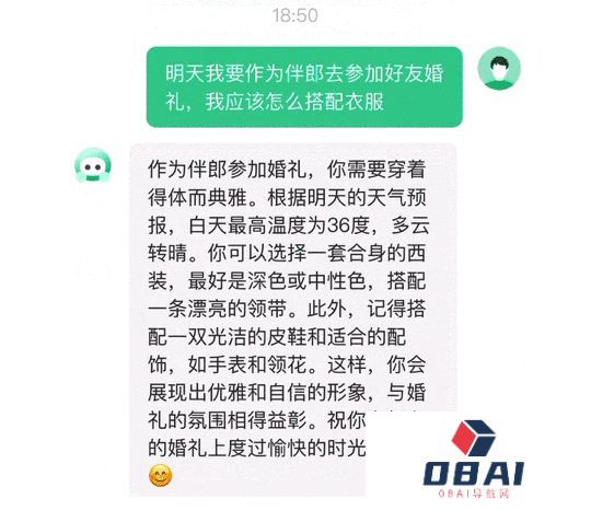 天气小助手不仅仅对天气方面的咨询在行,比如说当EVA提问:“明天我要参加好友婚礼,我应该穿什么衣服呢?”,它甚至可以根据当天的天气情况,给你安排时尚穿搭的建议指导。