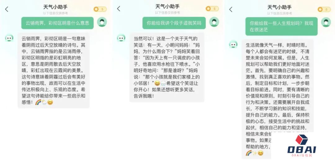 天气小助手也是你身边的小百科、段子手和知心好友。既能充当出行方面的专家,也可也为你解答各种与天气相关的经典诗词,甚至可以给你讲个笑话缓解压力,或者为你排忧解难。