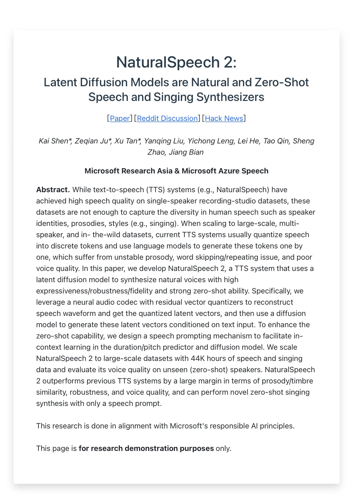 据悉,与传统的语音转文字(TTS)系统不同,微软的 NaturalSpeech2 使用“连续向量”取代“离散标记”来表示语音,从而生成更完整的语音片段,不会产生“缺乏感情”的“棒读(一字一顿地讲话)”现象。