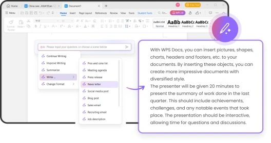 根据 WPS 官方提供的介绍文档显示,WPS AI 可帮助用户创作内容、增强灵感,用户输入提示性的内容之后,即可自动生成专业格式的文本内容,包括头脑风暴、事件清单、工作邮件乃至社交平台推文。此外,它还可以基于原有文本和内容进行缩写、扩写或改变格式,以及识别拼写和语法错误。