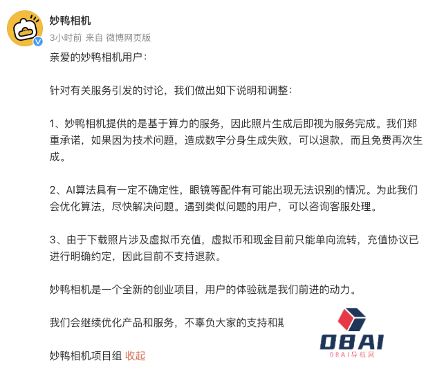 7月26日,妙鸭相机在官微发布公告回应退款争议,表示照片生成失败可退款,并对有关服务引发的讨论,做出说明调整。