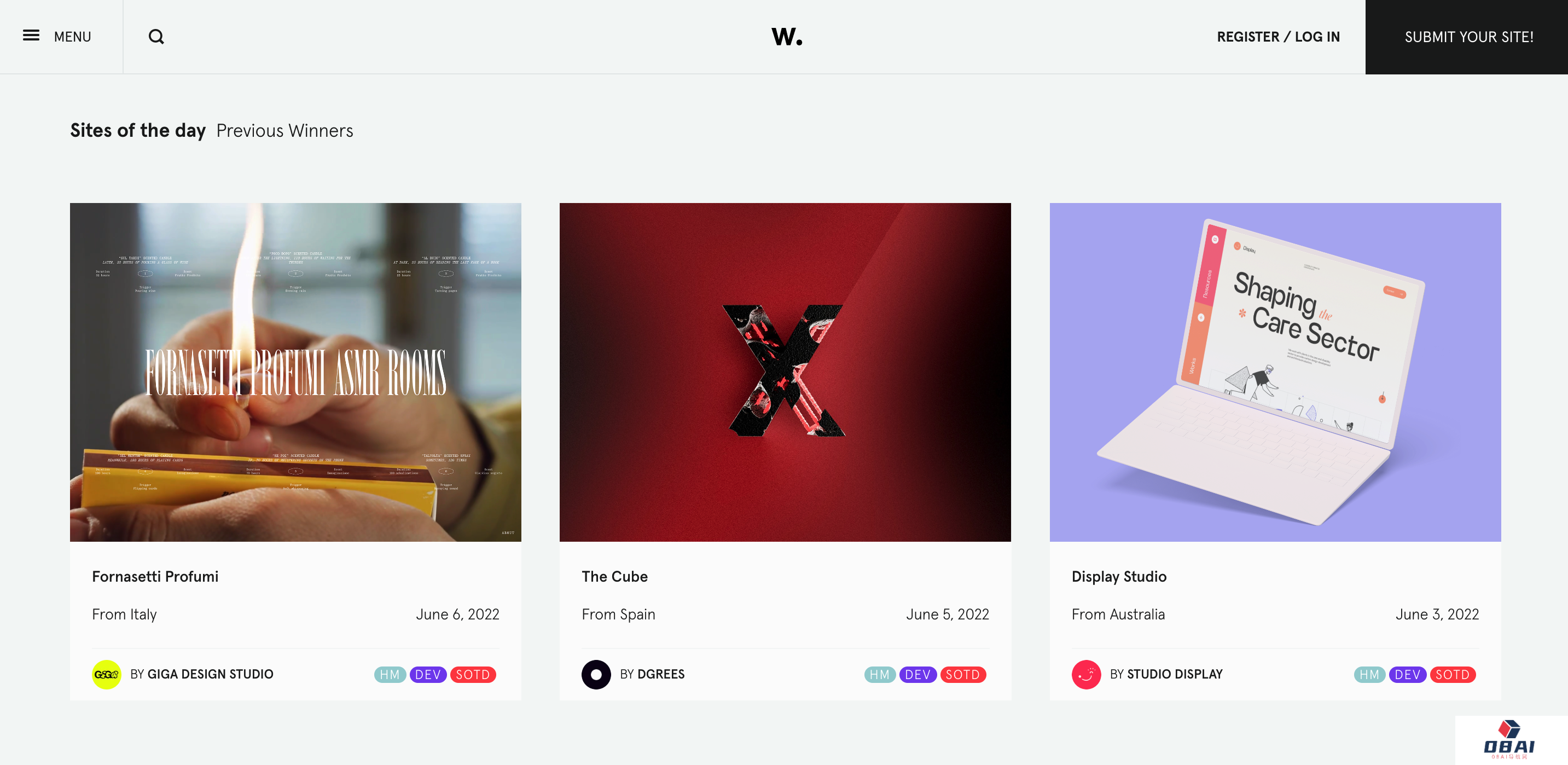 拥有大量获奖网站设计作品,可以允许用户对上面发表的作品在设计、创意、实用性、内容四个方面进行评分,分数显示的机制是用户的评级,具有可靠性。同时网站支持多种语种切换,便于世界各地的用户使用。