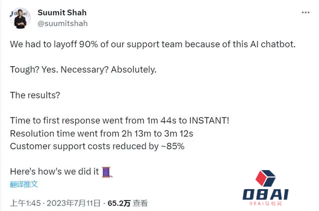 印度电商平台Dukaan创始人兼首席执行官本周一发推特称,在引入AI聊天机器人来回答客户问题后,公司90%的员工已被解雇。他解释说,在引入AI助手后,解决问题时间从之前的2小时13分钟缩短到了3分12秒。他说:“鉴于经济状况,初创公司优先应该考虑的是‘盈利能力’。”