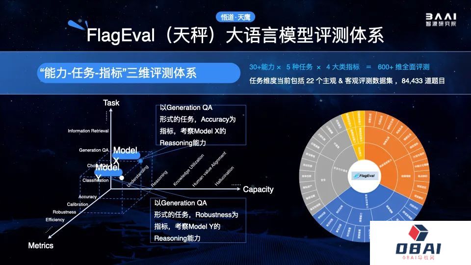 FlagEval构建了“能力-任务-指标”三维评测框架,深度测试基础模型的认知能力边界颗粒,并可视化呈现评测结果。