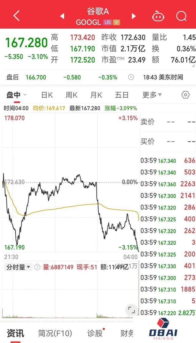 截至当地7月25日收盘,谷歌A报167.28美元,跌幅3.10%,市值2.1万亿美元。