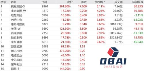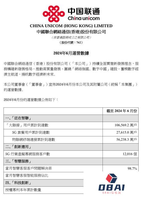 医药股涨幅居前,康龙化成涨6.43%,药明生物涨3.88%。个股方面,低迷多日的东方甄选开盘后一路拉升,最高涨幅达13.24,午后涨幅收窄,全天收于11.72港元,涨7.72%。小鹏汽车与大众汽车集团签订电子电气架构技术战略合作联合开发协议,股价涨近4%。九毛九预计上半年股东应占溢利同比降69.8%,股价跌逾10%。从行业表现看,恒生行业指数日内多数上涨。资讯科技业指数涨2.23%,医疗保健业指数涨2.06%,公用事业指数涨1.67%。跌幅方面,原材料业指数跌0.31%。从盘面来看,Wind概念板块多数上涨。今日头条系指数涨8.71%,电子烟指数涨6.99%,烟草指数涨6.99%。跌幅方面,汽车电子指数领跌2.72%,钴金属指数跌2.02%,富士康指数跌1.54%。中国联通“大联接”用户累计超10亿户积极布局人工智能7月22日收市后,中国联通在港交所发布2024年6月运营数据。截至2024年6月份,“大联接”用户累计达10.66亿户,5G套餐用户累计达2.76亿户,物联网终端连接累计到达5.62亿户。